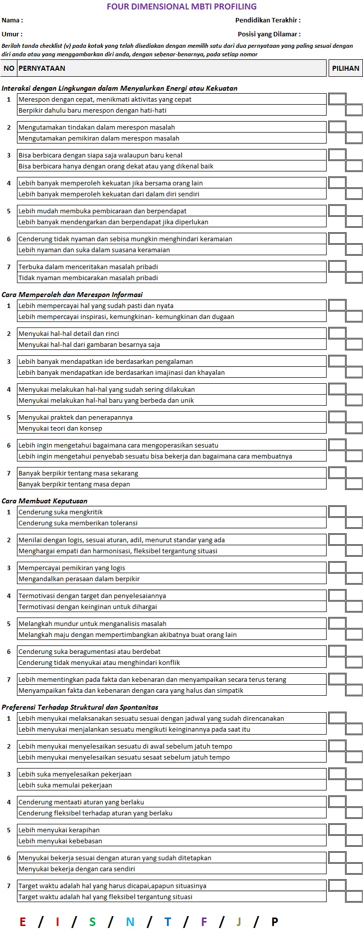 Untuk mengetahui personality anda berdasarkan Tipe MBTI atau 16 Tipe Kepribadian, silahkan lakukan tes di bawah ini