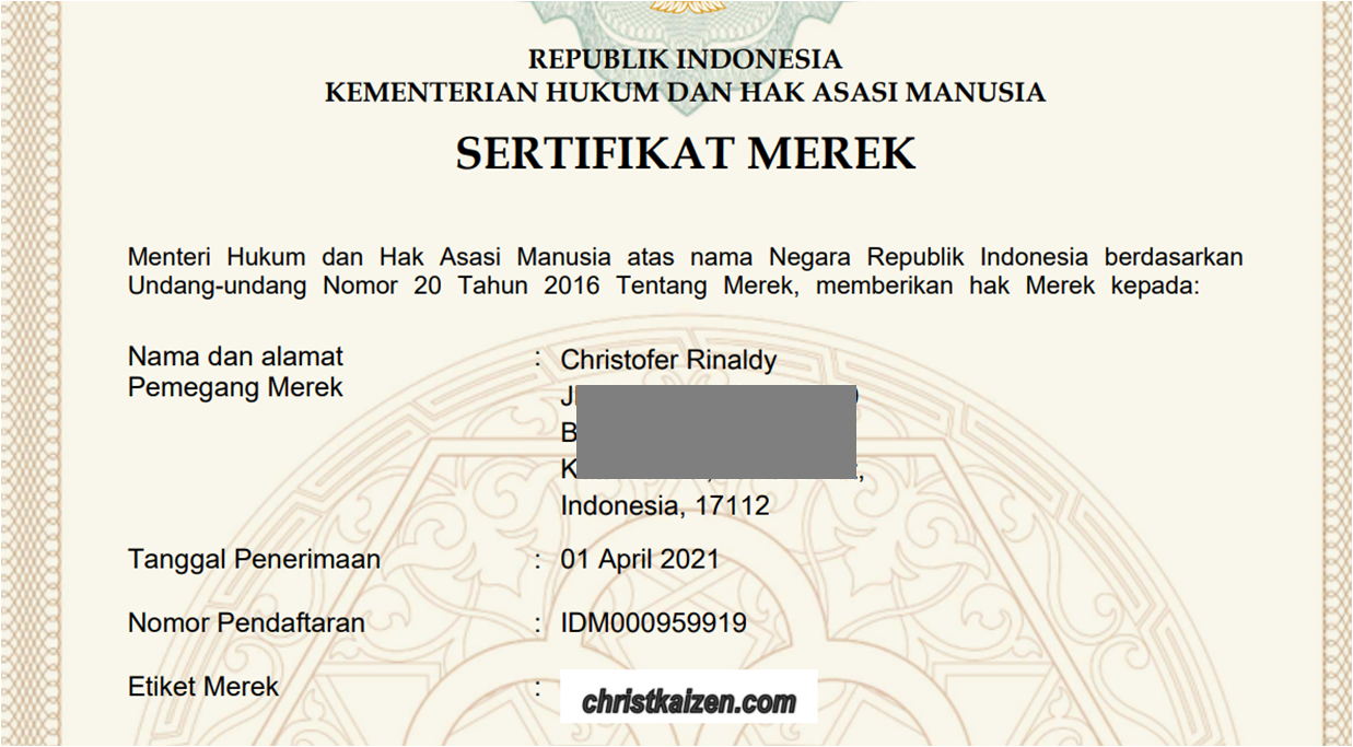 O iya sekarang christkaizen.com sudah sah mendapatkan HAKI untuk Hak Merek sejak April 2021, dan sertifikatnya sudah ada