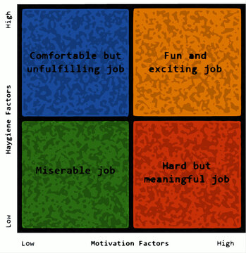 Hygine Factor, berkaitan dengan lingkungan di sekitar pekerja, sedangkan Motivator Factor, berkaitan dengan si pekerja atau orangnya langsung. Jadi menurut Herzberg, untuk meningkatkan motivasi, dapat dilakukan dengan meningkatkan motivasi pekerja, dan meningkatkan faktor lingkungan, atau dengan kata lain, meningkatkan Kepuasan dan menurunkan Ketidakpuasan dapat meningkatkan motivasi.